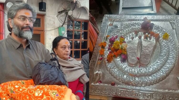 दर्शन के लिए पहुंचे मां-बेटा। मां के दरबार में एक श्रद्धालु की तरफ से चढ़ाई गई चांदी की चरण पादुका।