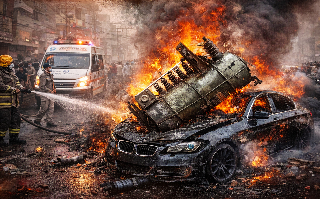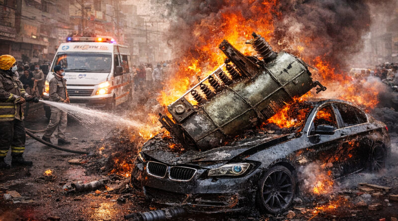 लुधियाना में तेज रफ्तार BMW ट्रांसफार्मर से टकराई, कार में लगी भीषण आग
