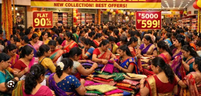 5..JAN..महाराष्ट्र के एक बड़े शहर में 5000 रुपये कीमत की साड़ियों पर 90 प्रतिशत की भारी छूट की खबर फैलते ही बाजार में जबरदस्त भगदड़ मच गई। एक निजी कपड़ा शोरूम द्वारा आयोजित इस सेल में सैकड़ों की संख्या में महिलाएं सुबह से ही लाइन में लग गईं। जैसे ही शोरूम के दरवाजे खुले, भीड़ बेकाबू हो गई और हालात संभालना मुश्किल हो गया।