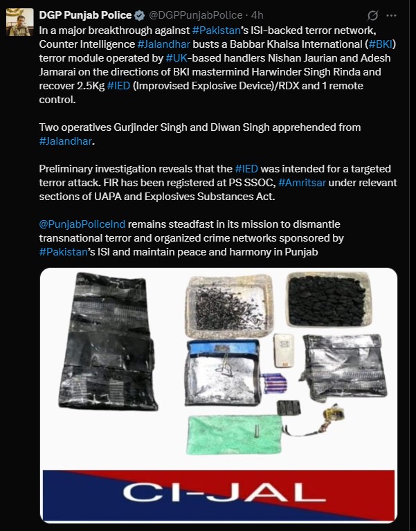 काउंटर इंटेलिजेंस जालंधर ने पाकिस्तान के आईएसआई समर्थित आतंकी नेटवर्क के खिलाफ बड़ी सफलता हासिल की है। टीम ने बब्बर खालसा इंटरनेशनल (बीकेआई) के एक सक्रिय आतंकी मॉड्यूल का भंडाफोड़ किया, जिसका संचालन ब्रिटेन स्थित हैंडलर निशान जौरियन और आदेश जमाराय द्वारा बीकेआई के सरगना हरविंदर सिंह रिंदा के निर्देश पर किया जा रहा था।