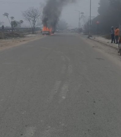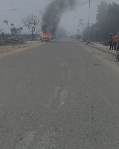 Highway पर कार को लगी भीषण आग, जलकर राख