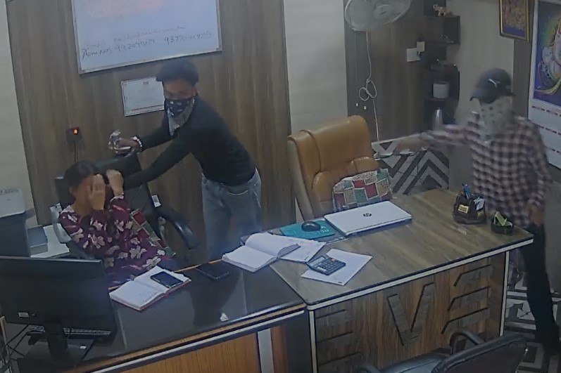 कुछ समय बाद दूसरा आरोपी चेक शर्ट और मास्क पहनकर दुकान में प्रवेश करता है, जबकि तीसरा साथी बाहर एक्टिवा पर इंतजार कर रहा होता है। दोनों अंदर खड़े होकर सही मौके का इंतजार करते हैं। जैसे ही उन्हें मौका मिलता है, एक बदमाश पीछे से महिला का मुंह दबोच लेता है और दूसरा आरोपी तिजोरी से नकदी निकाल लेता है।