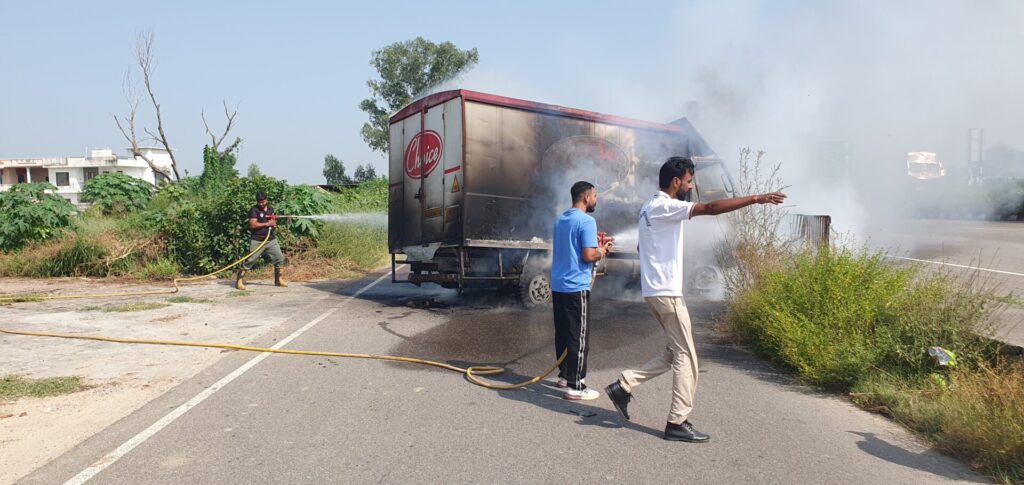 फिलौर। कपुरथला से अंबाला जा रहे ट्रक ड्राइवर संदीप ने बताया कि फिलौर गुरैया के पास आर.सी. प्लाजा के पास गाड़ी में अचानक टि्क-टि्क की आवाज़ आने लगी। कुछ ही समय बाद ट्रक में आग के लपटें उठने लगीं। हाईवे पर सुरक्षा कारणों से वह तुरंत गाड़ी रोक नहीं सके।