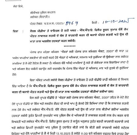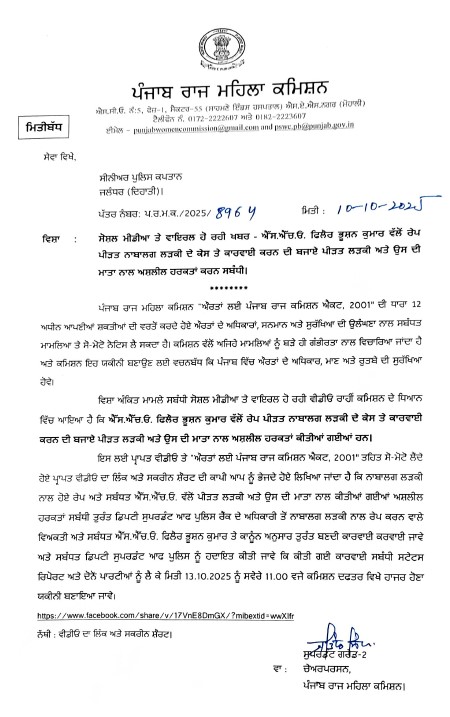 महिला आयोग ने कहा कि यह मामला महिलाओं के सम्मान और अधिकारों के गंभीर उल्लंघन से जुड़ा है। आयोग ने पंजाब राज्य महिला आयोग अधिनियम, 2001 की धारा 12 के तहत अपनी शक्तियों का प्रयोग करते हुए जांच के आदेश दिए हैं। आयोग ने एसएसपी को निर्देश दिया है कि डिप्टी सुपरिंटेंडेंट ऑफ पुलिस (डीएसपी) रैंक के अधिकारी से मामले की जांच करवाई जाए और रेप आरोपी तथा एसएचओ भूषण कुमार के खिलाफ तत्काल कार्रवाई सुनिश्चित की जाए।